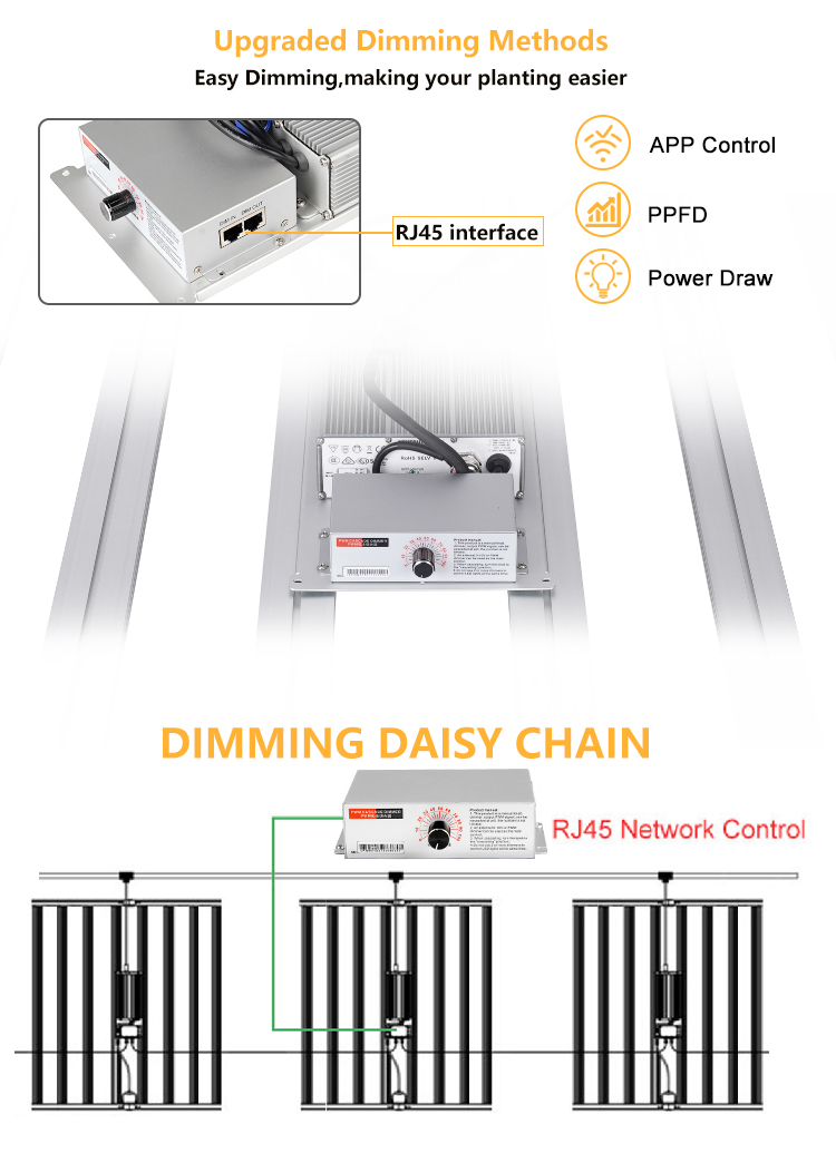 For different cultivars, propagation and vegetative growth periods the may be dimmed without losing efficiency. The high efficiency and low powered LED configuration with 8 LED bars reduces the temperature of the LEDs increasing the output and improving light maintenance.
