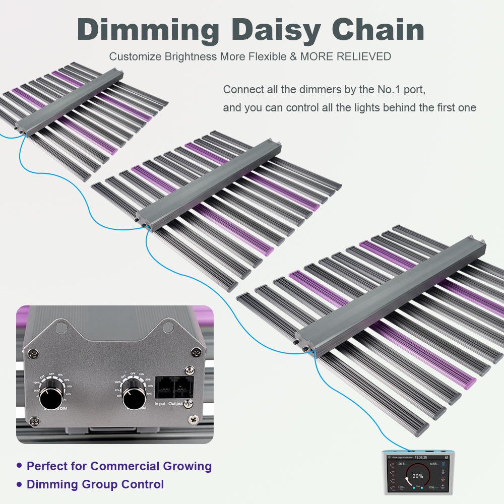 MEIJIU-TX-MAX-1350W led fixture can also be externally controlled with a RJ45 dimmer or wireless WIFI controller, with main controller, featuring light timing, automated dimming (1% increments), temperature safety control, Sunrise & Sunset Mode for up to 100 fixtures per controller.