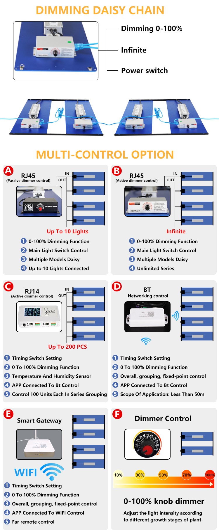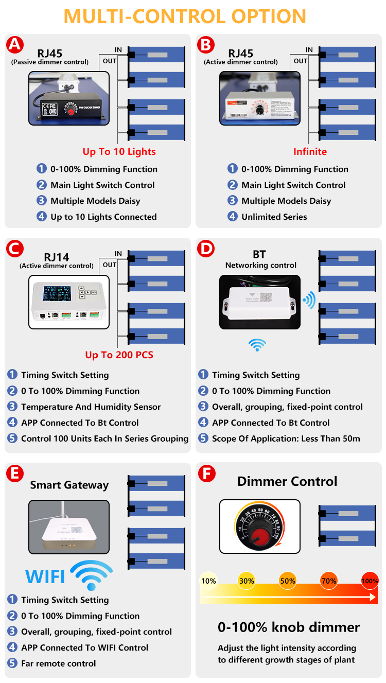 This NB480 fixture can also be externally controlled with a RJ45,RJ14,BT Networking controller, with main controller, featuring light timing, automated dimming (1% increments), temperature safety control, Sunrise & Sunset Mode for up to 100 fixtures per controller.
