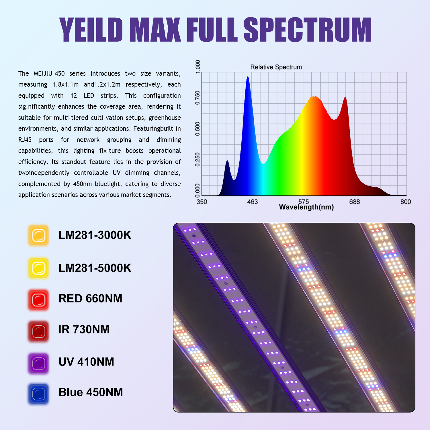 - Top bin LEDs Samsung lm281B, deep red 660nm, far red 730nm UV450 and UV395nm- Two Independently controlled UV bars- External control with main Controller