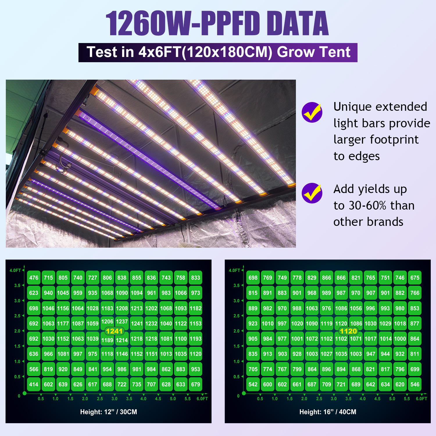 - Efficacy up to 2.7 µmol/s/J- PPF output 3402µmol/s- Unique and innovative large foldable frame designed for wider rectangular coverage- Outstanding light spread and distribution in 120x180cm grow area- Highly Pre-assembly- New Clear Glue protection cover technology on LED bars