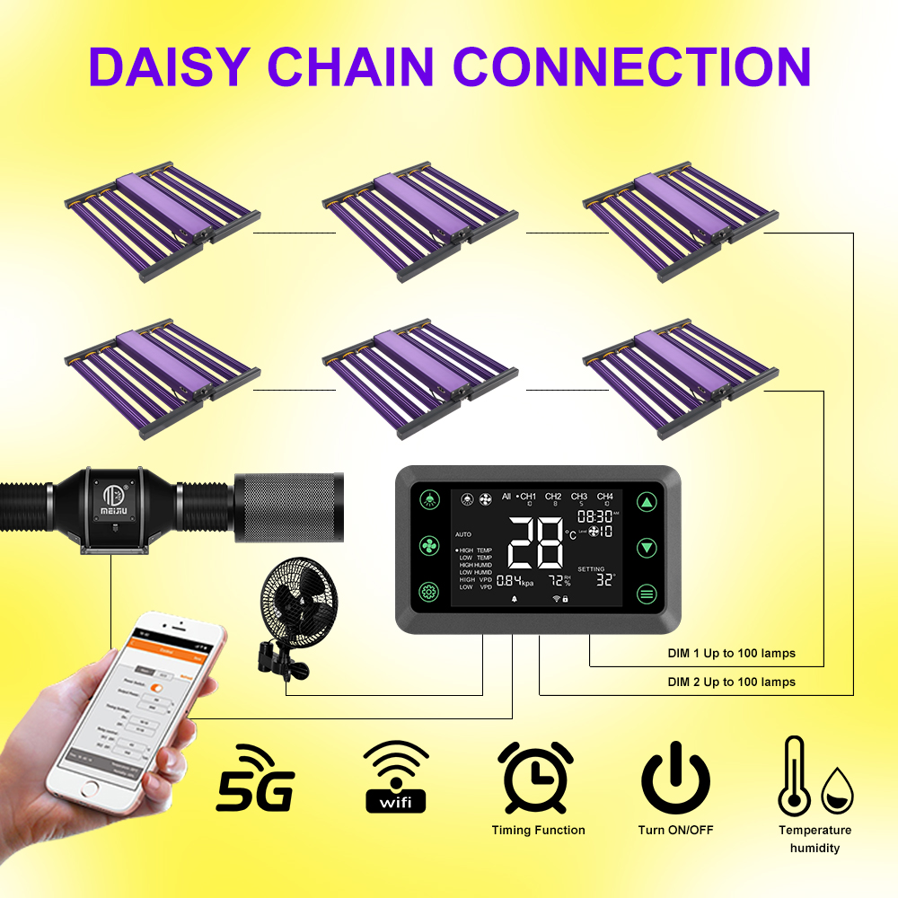 MJ450 MINI MAX 320W led fixture can also be externally controlled with a RJ45 dimmer or wireless WIFI controller, with main controller, featuring light timing, automated dimming (1% increments), temperature safety control, Sunrise & Sunset Mode for up to 100 fixtures per controller.