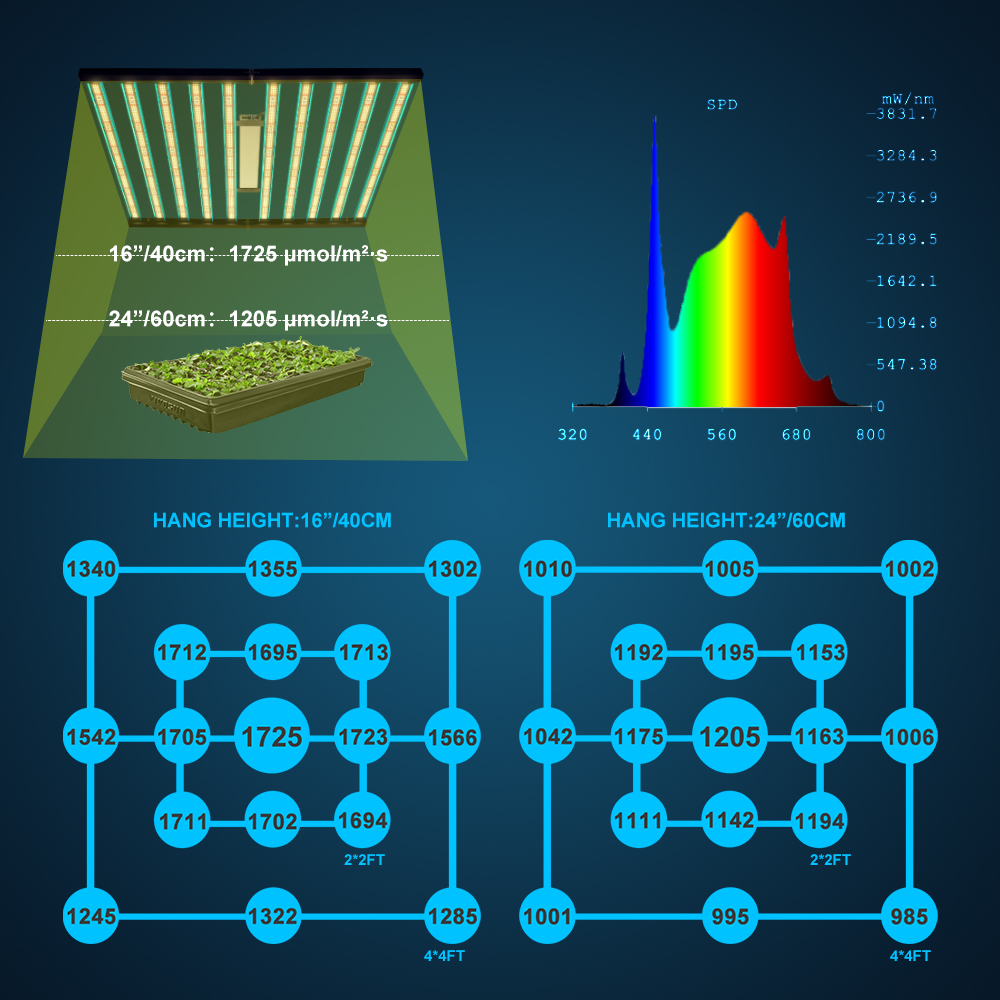 - Very high efficacy up to 2.6 µmol/s/J- Very high PPF output for high intensity 2440µmol/s- Unique and innovative large F10 frame designed for wider rectangular coverage- Outstanding light spread and distribution in 1.2x1.2m grow area- High quality Inventronics LED drivers- New Clear Glue protection cover technology on LED bars