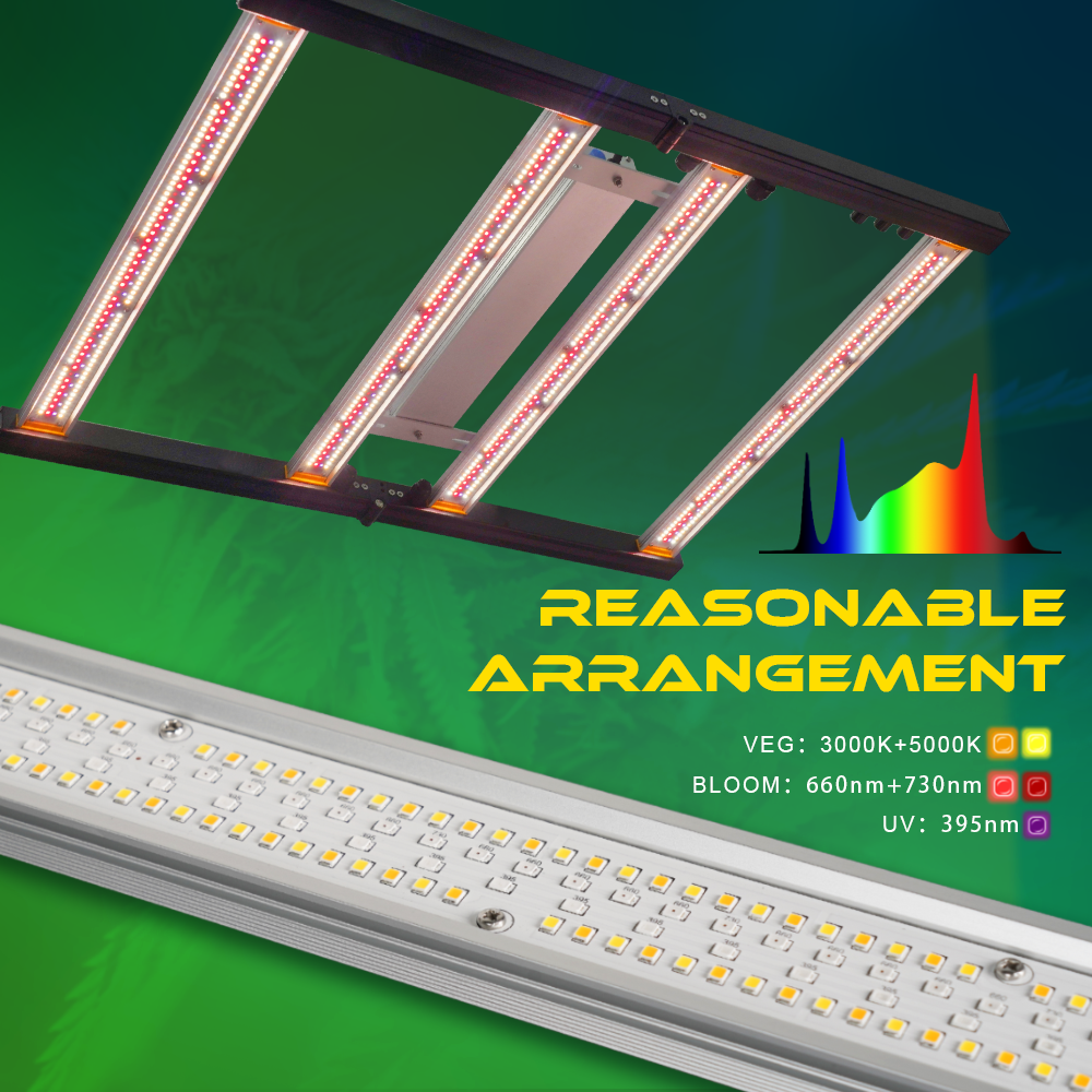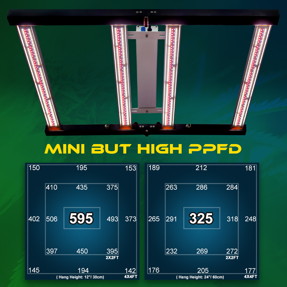 - Very high efficacy up to 2.6 µmol/s/J- Very high PPF output for high intensity 567 µmol/s- Unique and innovative large foldable frame designed for wider rectangular coverage- Outstanding light spread and distribution in 80x80cm grow area- High quality Turefulll LED drivers- New Clear Glue protection cover technology on LED bars
