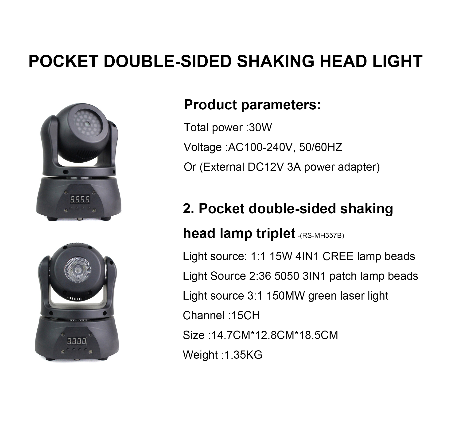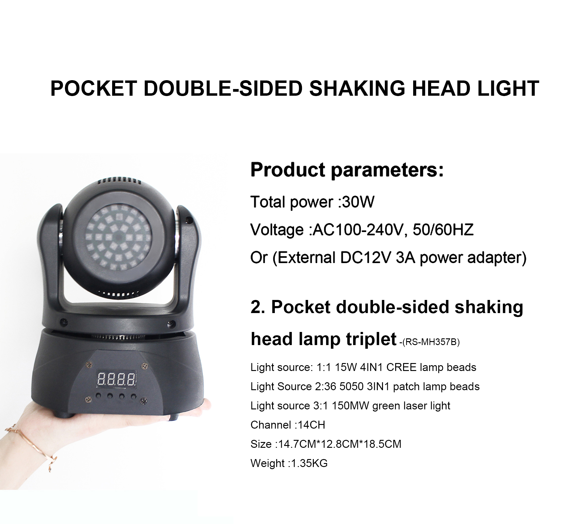 Pocket Dual-Sided Moving Head Light 30W with 15W 4-in-1 CREE LED 36x5050 RGB SMD LEDs 150mW Green Laser 15 Channels DMX512 and Sound Activated Kaleidoscope Laser and Flow Effects for Wedding DJ Party Stage Lighting